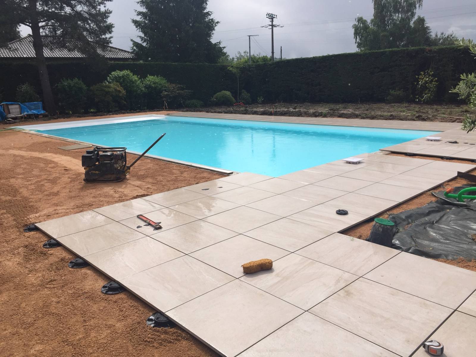 À Jasseron, cette création piscine rectangulaire 6×3 m avec liner sable, margelles harmonieuses et couverture Stilys Duo, dans un jardin en cours d’aménagement.